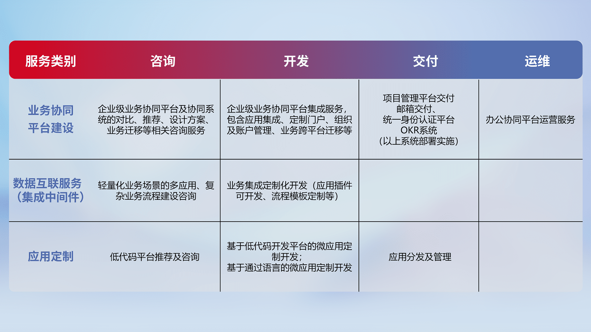 针对钉钉、、企微、、、、IDaas等平台级产品提供产品的规划、、、、方案、、、、交付、、、、定制化开发等服务,,,实现如统一协同办公、、智能客户服务、、、混合会议管理、、、智能数据查询、、、等业务场景,,实现数字化转型。。。