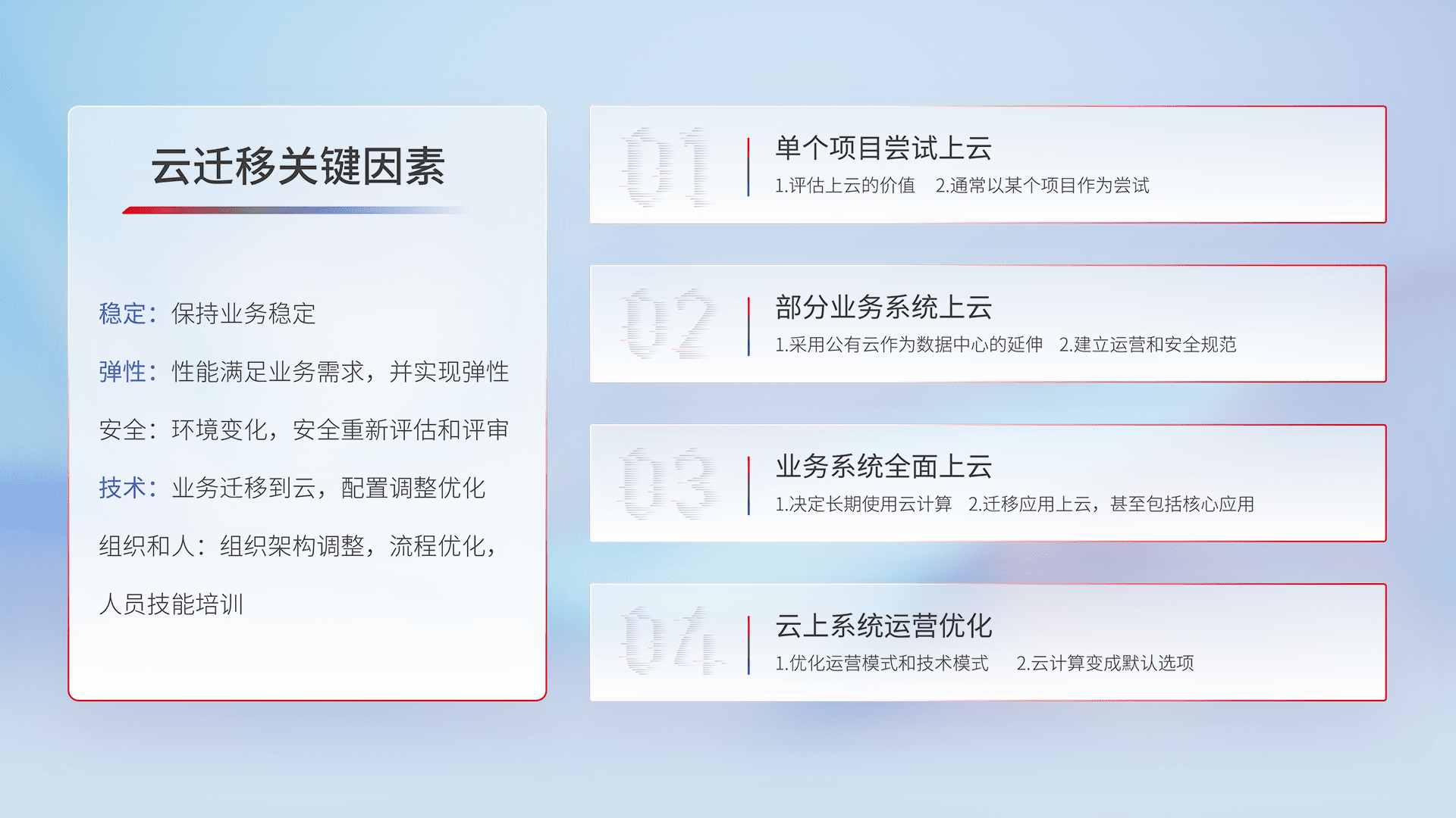 结合实际业务,,,,从规划设计、、、、云平台选型、、、、云原生改造、、、数据迁移、、、、集成交付,,,,迁移全过程为客户识别最佳上云路径,,做好风险识别管理,,,,设计网络架构、、、身份权限、、、、安全审计合规、、、操作审计、、、、日志审计、、监控告警策略、、多站点容灾设计等,,,对云上基础设施进行整体规划,,提升IT治理水平,,,,以满足弹性、、高可用、、、高性能的需求。。。
