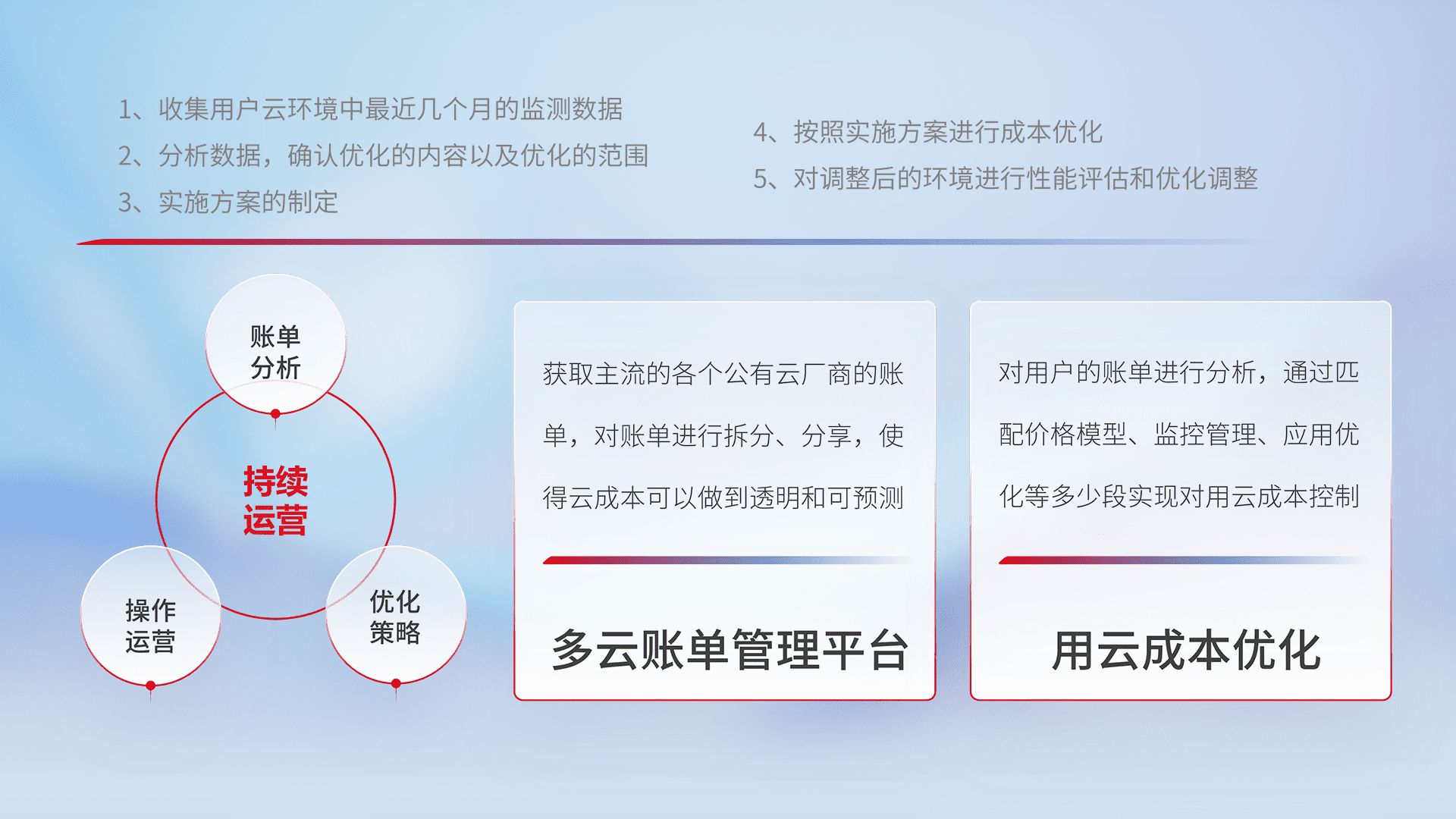 通过多云纳管,,以统一的资源数据模型把客户的云资源进行抽象和封装,,,,进而实现对多云资源的统一操作,,保障云资源管理的可靠性、、、稳定性与可用性。。。。量身定制化运维内容,,,配置、、、、开发运维、、、、补丁管理、、、、备份、、、监控、、、认证和访问管理、、、审计和日常巡检等,,保障在用云过程中的可靠度,,,,稳定度以及高可用率。。。。
