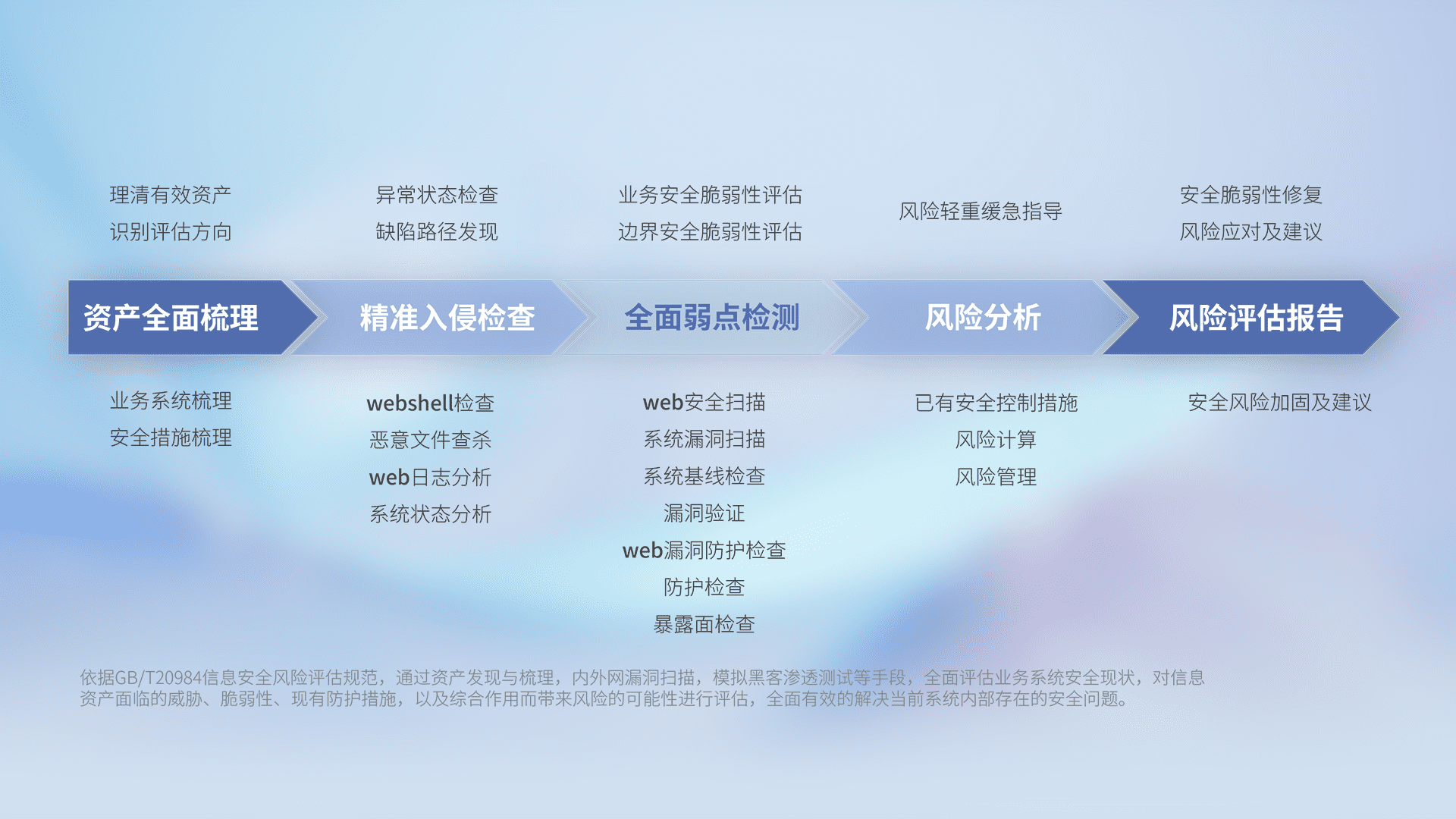 针对客户行业特性,,以专业的安全服务+多厂商联合解决方案提供专属的一站式安全管理服务,,,,帮助客户全面感知网络空间威胁,,,,基于识别、、、、检测、、分析、、防护、、、、监测、、响应的服务理论模型,,从方案咨询、、、集成交付、、评估验证、、优化加固、、、、运维运营,,,致力于为客户提供完整的闭环管理式安全服务。。。以实战经验为客户打造高抵御风险的安全体系,,,,帮助客户发现威胁、、、、对抗威胁、、、处置威胁,,不断积累安全对抗能力,,,,持续保障数字化安全。。。。